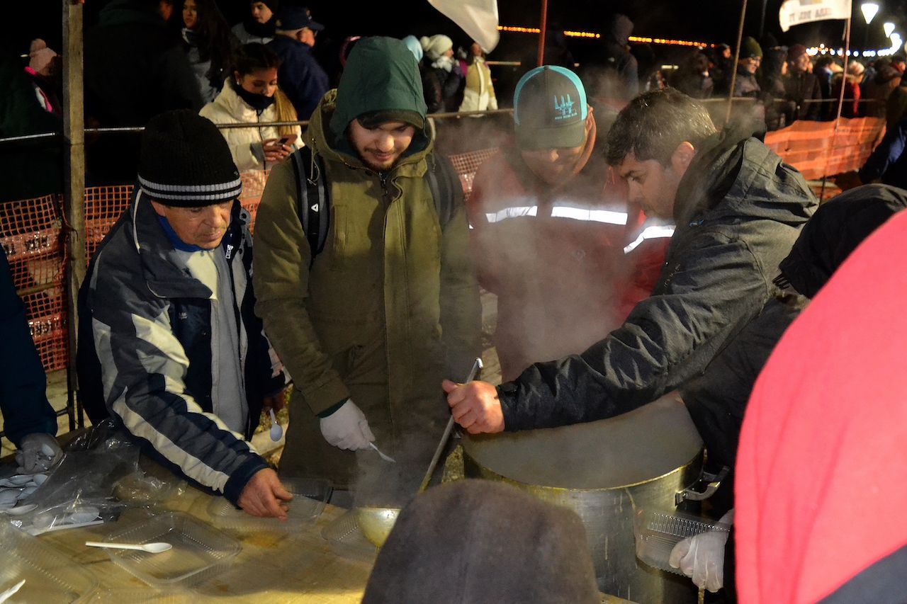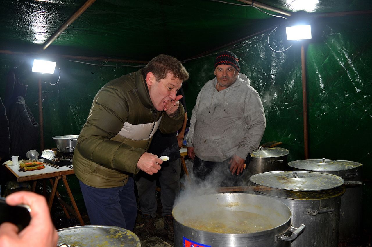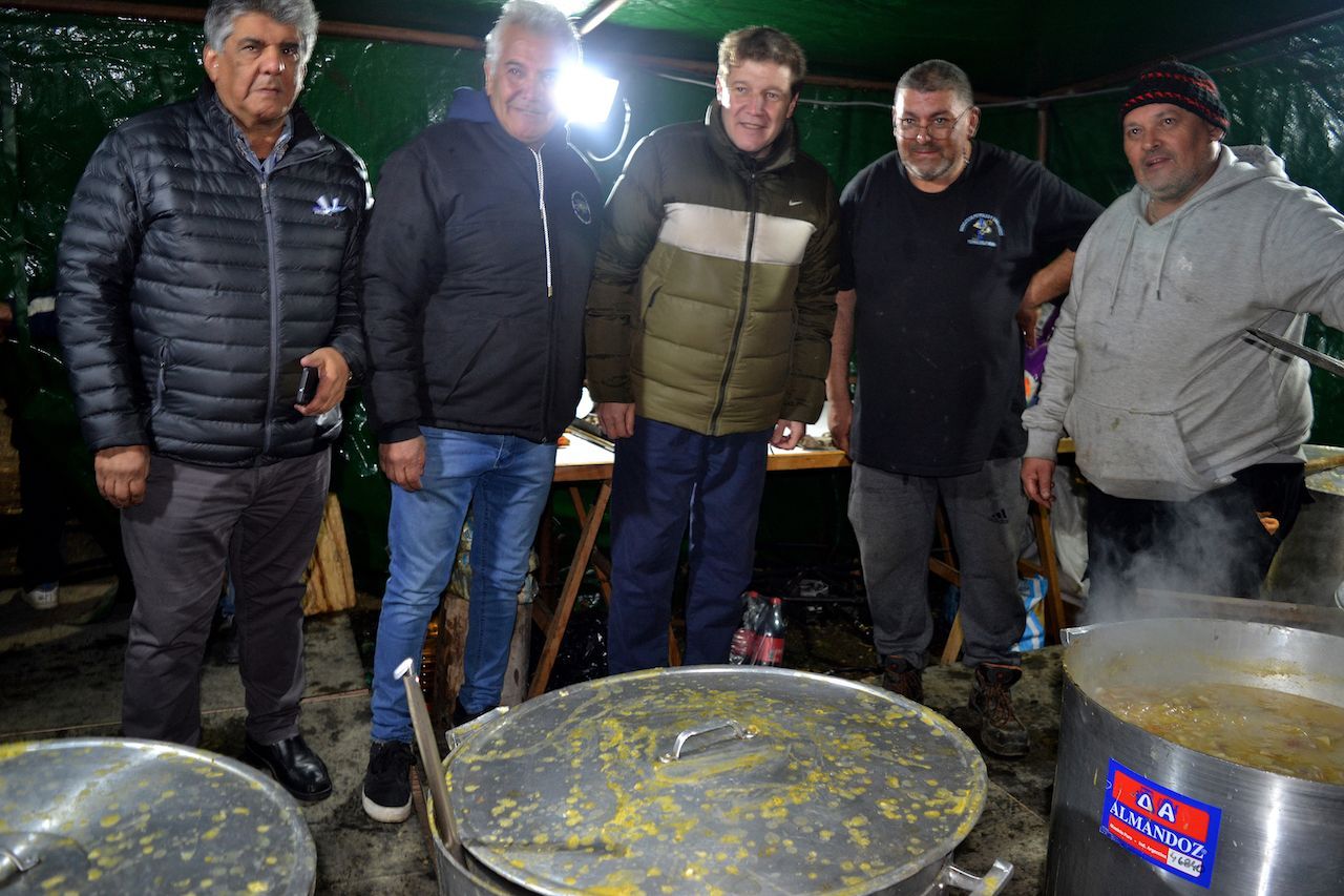 El gobernador Gustavo Melella estuvo presente en el espacio donde se cocinó el locro, donde degustó el delicioso plato y además compartió un momento con los trabajadores petroleros que estuvieron a cargo de la elaboración y de hacer el reparto de las porciones entre todos los presentes.